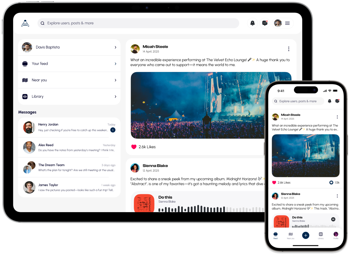 Audeez is built for convenience, whether you’re at home or on the go. With both a web platform and a mobile app, you can seamlessly browse, connect, and collaborate from anywhere. Discover new opportunities, grow your network, and manage your music career effortlessly — whether you’re on your laptop, tablet, or phone. Stay in control, stay connected, and make every moment count with Audeez.